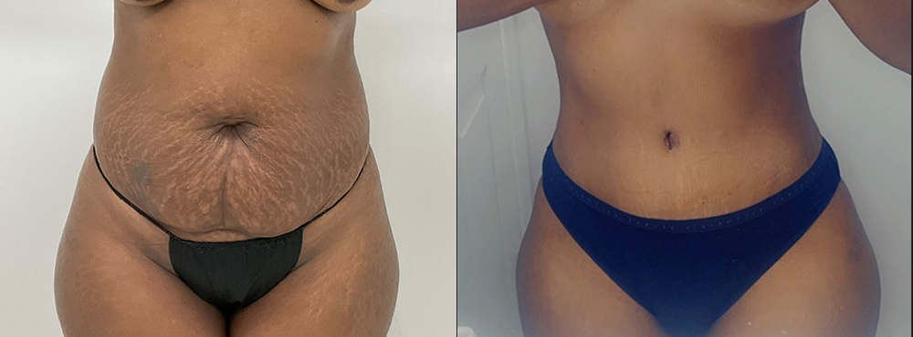 Después de realizarse la cirugía para remover piel y grasa en exceso (abdominoplastia) de su abdomen, esta paciente femenina de 34 años muestra sus resultados de antes y después. Para conseguir un cuerpo totalmente remodelado y un abdomen de aspecto más liso y plano, se eliminó con el procedimiento el exceso de piel y grasa, mientras que los músculos abiertos tras 3 partos se tensaron. Ahora tiene una cintura más definida y un perfil general más firme.