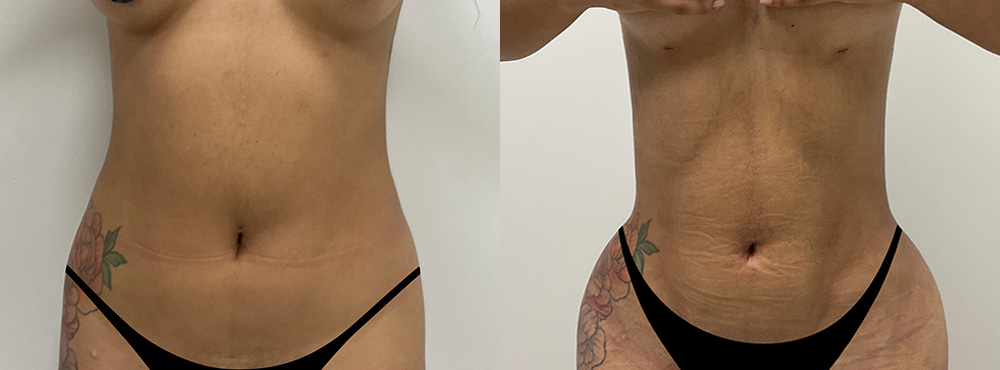 Esta paciente se sometió a varios procedimientos de contorno corporal incluido el aumento de gluteos con grasa (BBL). Para lograr la figura con curvas perfectas a las que aspiraba cuando llegó a nuestra clinica en Miami, la dra Luster le realizó una liposucción en toda la circunferencia de la parte media del cuerpo (Lipo 360) y definió su abdomen para agregar finalmente 600cc de grasa en cada glúteo, dándole la forma de reloj de arena que quería la paciente. Los resultados de las fotos muestran una diferencia considerable en el contorno y la figura que mostraba antes y después de la cirugía.