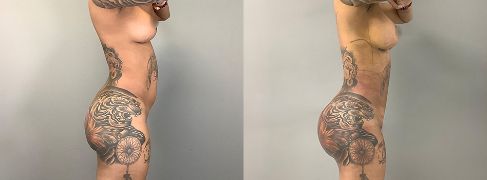 Después de un levantamiento de glúteos brasileño, la figura de esta paciente de 27 años ahora está más definida y contorneada. Su cintura es más delgada y se añadió 1000CC de grasa en los glúteos y caderas. Ahora su trasero luce mas levantado, redondo y de apariencia natural, lo que ha mejorado su confianza y sus curvas.