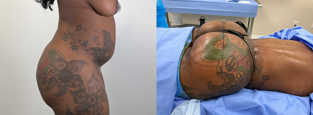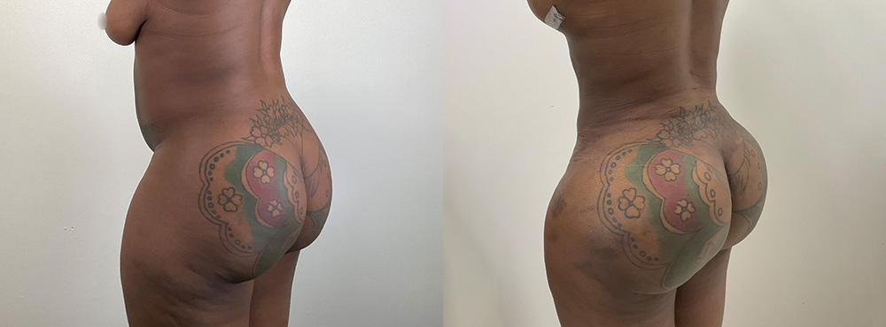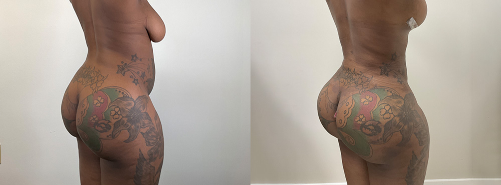 This 35-year-old patient, who has no children, underwent a breast lift and reduction without implants as part of a combined procedure with a BBL. During her evaluation, she was found to have grade 3 breast ptosis (significant sagging), but implants were not selected for this surgery. Following her inverted T breast lift, her breasts now have the height and proportion she desired, achieving a more balanced and natural look.